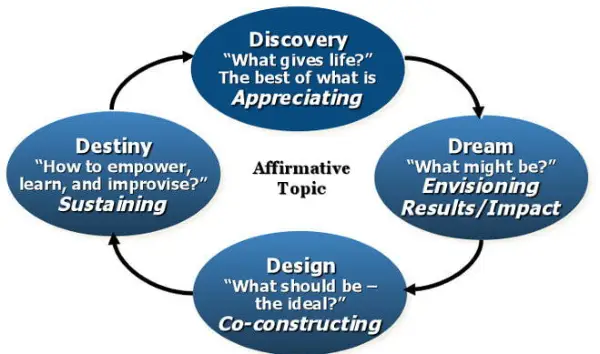 - Predstavljajte si, da ste se prebudili v najboljši možni prihodnosti naše organizacije. Vprašanja o intervjuju so zdaj zelo usmerjena v sanje in uporabljajo pozitivno kadriranje, da omogočijo optimistično, v prihodnost usmerjeno razmišljanje (CVDL, 2016). Priložnosti in domišljija sta ključna.