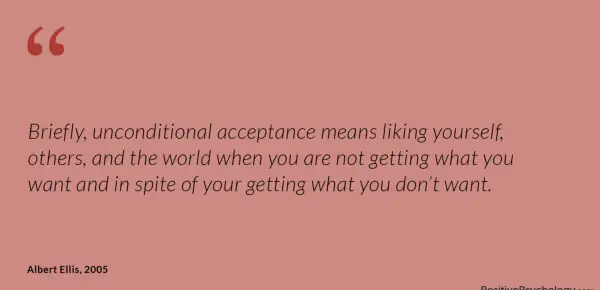 Na kratko, brezpogojno sprejemanje pomeni, da ste všeč sebi, drugim in svetu, ko ne dobite tistega, kar želite, in kljub temu, da dobite tisto, česar ne želite.