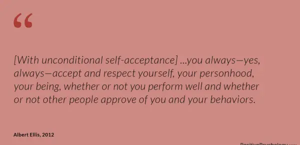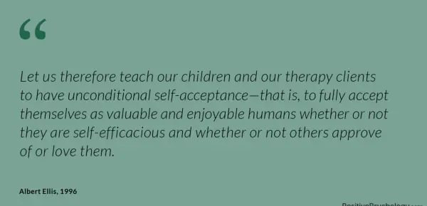 Zato naučimo svoje otroke in naše terapijske stranke, da imajo brezpogojno samoprejemanje-to je, da se v celoti sprejemajo kot dragocene in prijetne ljudi, ne glede na to, ali so samoumevni ali ne, ali jih drugi odobravajo ali ne ljubijo.