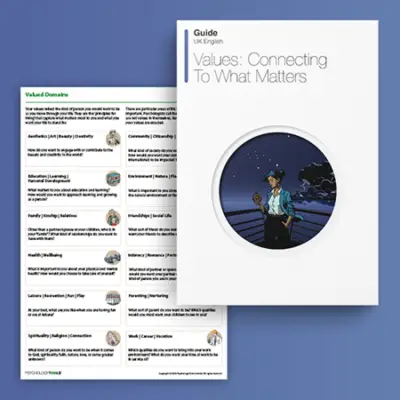 Razvit v sodelovanju s strokovnjakom ACT in avtorico dr. Jenna Lejeune, Vrednosti: povezovanje s tem, kar je pomembno je praktičen vodnik za samopomoč in uvod v temelj sprejemanja in zavezanosti (ACT). Namen ljudem pomagati najti, se povezati in sprejemati korake k njihovim vrednotam, kot nalašč za stranke, ki se počutijo odklopljene od tistega, kar jim je najbolj pomembno. Izdali smo tudi brezplačno, skrajšano različico za vse, ki jih lahko prenesejo: Uvod v vrednosti. Navdušeni smo, da ste jih toliko uporabljali!
