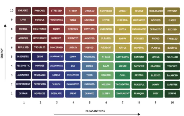 Zdaj vzemite dva rezultata in ju narišite na spodnjo lestvico čustev, da vidite, kako se ujemate: