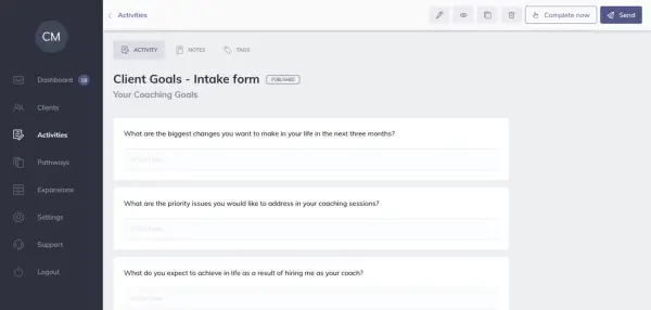 The most important aspects of the questionnaire are 1) ensure the questions you ask are relevant, in 2) use the information provided to follow up on those questions. The pre-coaching questionnaire isn’t just an empty exercise; the information should be used to shape your approach.