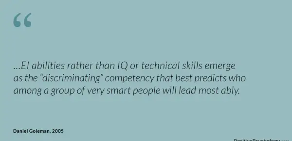 … EI sposobnosti in ne IQ ali tehnične spretnosti se pojavljajo kot diskriminatorna kompetenca, ki najbolje napoveduje, kdo bo med skupino zelo pametnih ljudi vodil najbolj spretno.