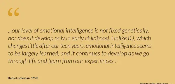 … Naša raven čustvene inteligence ni genetsko določena, niti se ne razvije le v zgodnjem otroštvu. Za razliko od IQ, ki se po naših najstniških letih malo spremeni, se zdi, da se čustvena inteligenca v veliki meri nauči in se še naprej razvija, ko gremo skozi življenje in se učimo iz svojih izkušenj ...