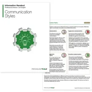 Težave s komunikacijo so povezane z različnimi težavami na področju duševnega zdravja, pa tudi s težavami v odnosih in pri delu. The Komunikacijski slogi Informacije je zasnovano tako, da strankam uvaja asertivne in neasertivne (tj. Pasivne, agresivne in pasivno-agresivne) sloge komunikacije. To je še posebej koristno za stranke, ki želijo izboljšati svoje komunikacijske veščine, izboljšati svoje odnose ali razvijati nove veščine, na primer bolj asertivne ali postavljati meje z drugimi.