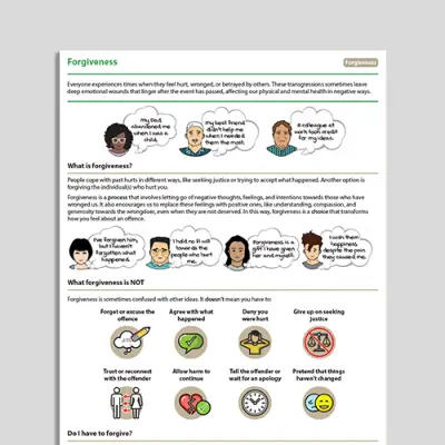 Z veseljem delimo naše nove informacije o informacijah Odpuščanje . Zasnovan tako, da podpira vsakogar, ki se sooča z medosebno poškodbo, pojasnjuje, kaj je odpuščanje, kaj vključuje in kako se razlikuje od drugih povezanih konceptov.