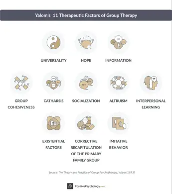 Irvin Yalom, pionir v skupinski terapiji, je opredelil več terapevtskih dejavnikov, zaradi katerih je skupinska terapija učinkovita (Smolar, 2000).