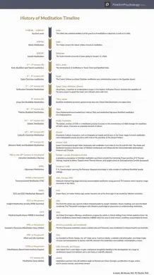 Naša časovna premica daje posnetek glavnih mejnikov v zgodovini meditacije, vendar so potrebne nadaljnje raziskave. Spodaj je nekaj posnetkov zgodovin dveh glavnih tradicij 20. stoletja.