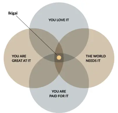 Ikigai je osebna in specifična za vsakega od nas, ki predstavlja, kje se srečujejo naše poslanstvo, poklicno in poklicno življenje.