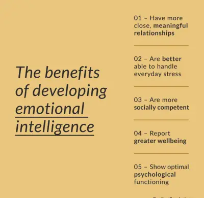 Raziskave kažejo, da obstaja veliko koristi za tiste z visoko stopnjo čustvene inteligence, vključno z večjo odpornostjo, socialnimi veščinami in povezanostjo.