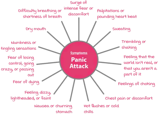 A Panični napad je epizoda intenzivnega strahu, ki včasih izhaja iz modrega (brez očitnega razloga). Običajno doseže vrhunec v nekaj minutah in vključuje občutek močnih občutkov v telesu in umu. Simptomi panike vključujejo: