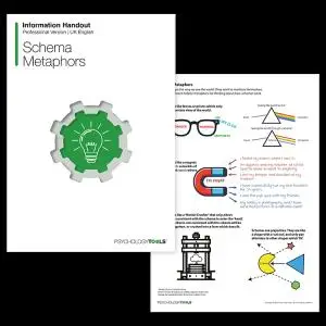 Metafore so lahko koristno orodje za stranke, ki razumejo zapletene ideje, vključno s procesi na ravni sheme. The Metafore sheme Serija je ilustrirana zbirka, ki je namenjena posameznikom, da razumejo, kakšne so sheme, kako delujejo in zakaj vztrajajo.