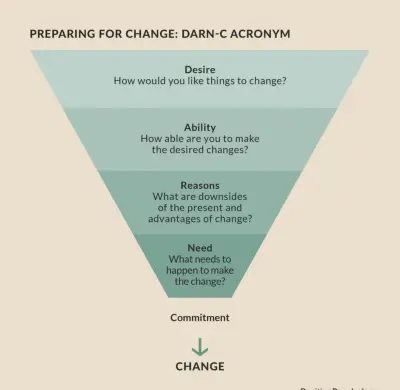 Akronim za darn-C želja , sposobnost , razlog , potrebe in zaveza , ki temelji na osnovah pogovorov o spremembah.