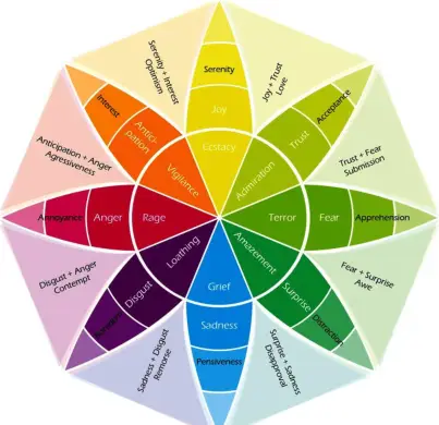 Ena bolj priljubljenih psiholoških teorij čustev je kolo Roberta Plutchika. Plutchik (1980) je izjavil, da obstaja osem osnovnih čustev: veselje, zaupanje, strah, presenečenje, žalost, pričakovanje, jeza in gnus. Plutchik je šel dlje, tako da je čustva združil s svojimi nasprotji in nato ustvaril kolo čustev, ki služi za natančnejšo podrobnost o tem, kako zapletena in interaktivna so naša čustva.