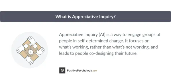 Vse gre za aktivno preiskavo in notranje zainteresirane strani si lahko drug drugemu postavljajo vprašanja, da odkrijejo, kaj Ludema in sodelavci imenujejo najboljše od tega, kar je. Čeprav je to osredotočeno na odkrivanje prednosti, je to tudi koristen način za preusmeritev trenutnih miselnosti in besedišča stran od razmišljanja, usmerjenega v primanjkljaj.