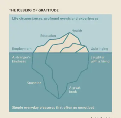 Pod površino najdemo vse preproste, vsakodnevne užitke, ki pogosto ostanejo neopaženi. To je morda odlična knjiga, ki smo jo imeli čas za branje, smeh, ki smo ga imeli s prijateljem, ali morda celo veselje, da jedo čokoladni sladoled na soncu. Ne glede na to, kakšni so ti preprosti užitki, nam zavestno izražanje hvaležnosti zanje resnično lahko pomaga razvijati prakso hvaležnosti zunaj površinske ravni.