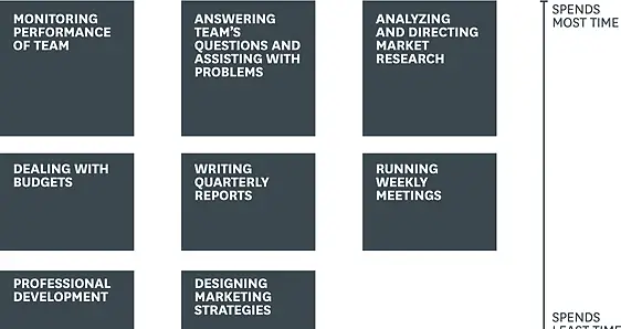 Tu vidimo analizo nalog; Fatimin sistematičen pristop k vizualizaciji tega, kar počne in koliko časa namenja različnim vidikom svoje tržne vloge. Veliko večji del njenega časa porabi za reševanje problemov s svojo ekipo in odgovarja na njihova vprašanja kot en primer. Naloge, do katerih je strastna - kot je strategija - segajo proti dnu, kjer preživi najmanj svojega časa.