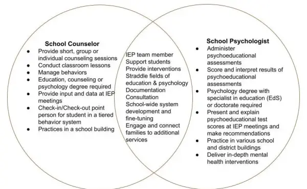 Vloge šolskega svetovalca in šolskega psihologa so podobne po tem, da želijo vsem učencem zagotoviti pomemben dostop do šolskega učnega načrta. Največje razlike med tema dvema poklicoma bi lahko bila priprava/izobraževanje in licenciranje.